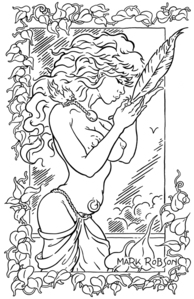 1995Bij een plas zit een mensachtig wezen met grote blanke vleugels. Uit zijn linkerhand valt water de plas in.