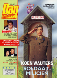 Achtergrond-illustratie bij foto van Koen Wauters. Zijn legerdienst werd toen in de media in de verf gezet. In het wachthokje in de achtergrond zijn de namen verwerkt van bekende Clouseau-hits.